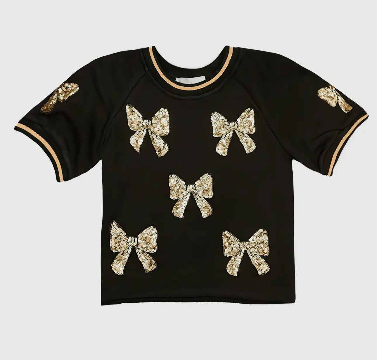 Add a touch of sparkle to your game day look with our Black and Gold Bows Top! Featuring playful bow details in gold sequins, this top brings fun and flair to your outfit. Perfect for cheering on your team in style while shining bright from the stands!